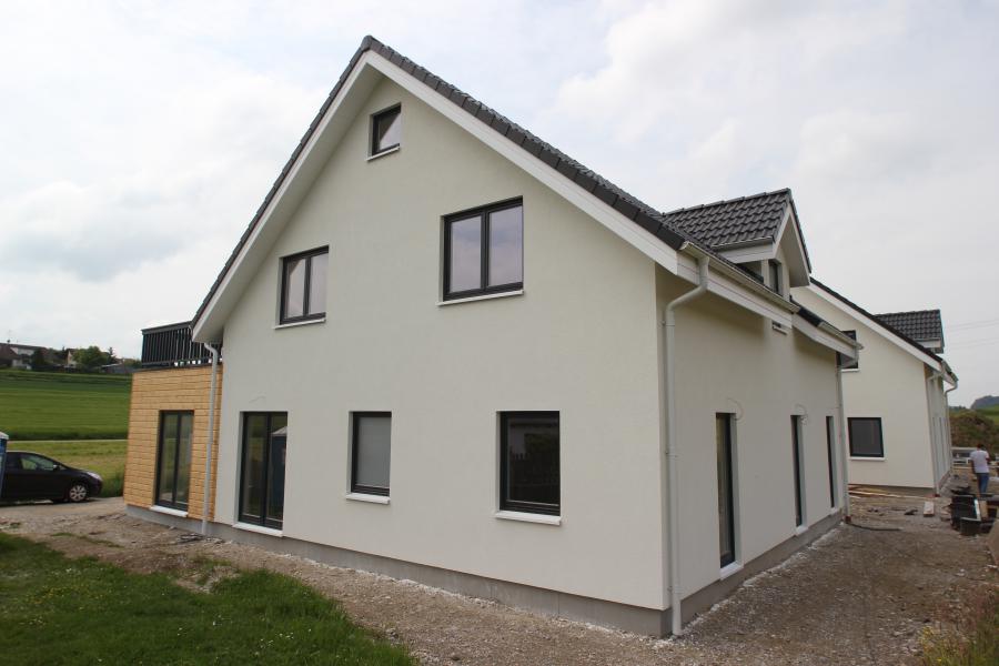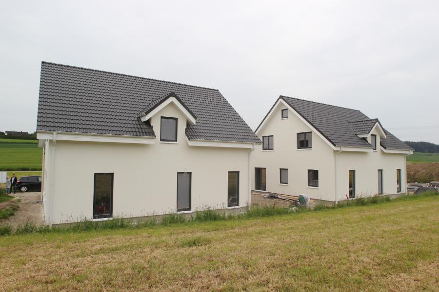 Realizacja dwóch budynków jednorodzinnych w technologii szkieletu drewnianego z pieknym tarasem dachowym. Metraż każdego z budynków to 180 m2. Zastosowano okna drewniane , część elewacji drewniana - malowana farbami Remmers oraz w tynku akrylowym , drzwi wejściowe drewniane , odwodnienie firmy Lindab - blacha powlekana , dachówka betonowa Braas , zgodnie z dokumentacją - wbudowane peszle pod instalację elektryczną. Parapety zewnętrzne aluminiowe , parapety wewnetrzne dębowe , surowe.