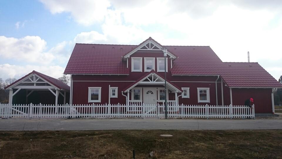 Budynek zrealizowany w technologii szkieletu drewnianego , okna drewniane , elewacja drewniana - malowana , drzwi wejściowe drewniane , odwodnienie firmy Lindab , dachówka betonowa Braas , zgodnie z dokumentacją - wbudowane peszle pod instalację elektryczną.