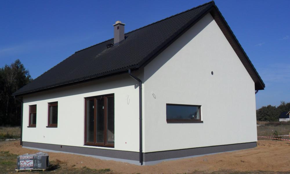 Dom parterowy bez poddasza użytkowego o powierzchni 100 m2 , wybudowany w technologii szkieletu drewnianego.Elewacja wykończona tynkiem akrylowym , dach pokryty dachówką firmy Braas w kolorze Grafit , rynny i rury spustowe PCV w kolorze grafit , okna PCV 6- komorowe 3-szybowe w kolorze orzech , rolety manulane w kolorze okien ( okno tarasowe wyposażone w roletę sterowaną elektrycznie ) , parapety zewnętrzne aluminiowe - kolor orzech ,parapety wewnętrzne z drewna sosnowego - malowane w kolorze orzech , schody strychowe , drzwi zewnętrzne firmy KMT,  wentylacja mechaniczna , komin do kominka , wewnętrzne instalacje :  elektryczna , grzewcza oraz wod-kan.
